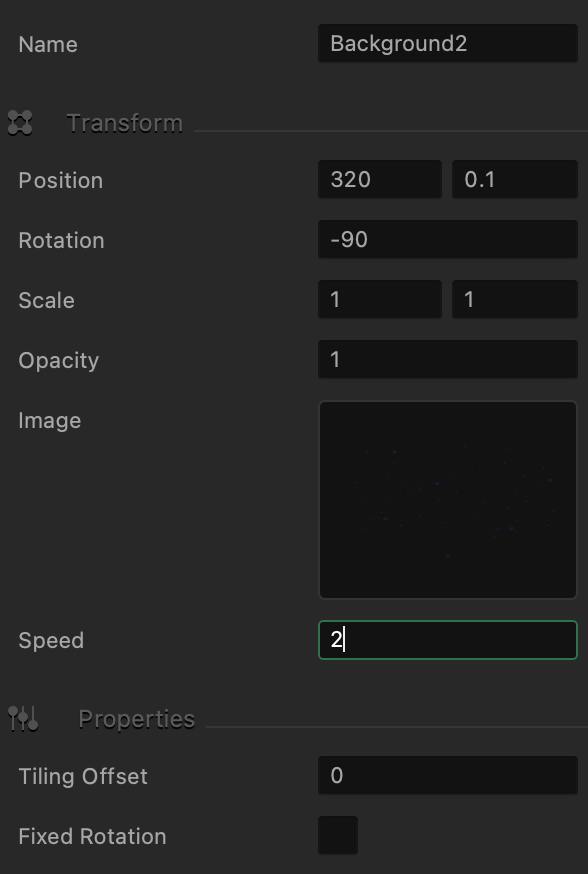 We simply select a background, modify and assign its speed number on the options panel. The higher the number, the faster a background will scroll. Select Background2 and set the speed to 2.