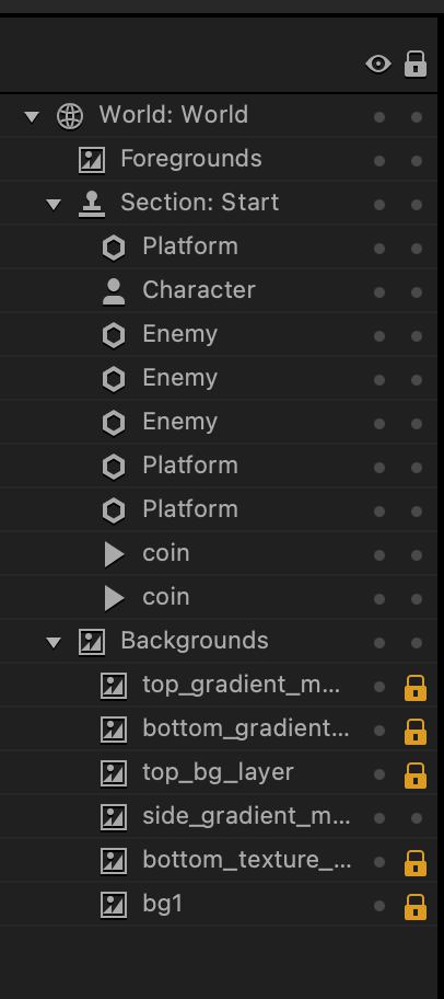 Next to the assets panel is the outliner. It shows a tree of all items in the scene. You can select any item in the scene by clicking on it in the tree. By default all items are listed in the order they were created. In the scene, items on top of the tree appears in front of other items below it. You can rearrange them by clicking and dragging an item. All non-background items are under Game Play Layer at the top. Press the trash icon down the bottom to delete the currently selected item.