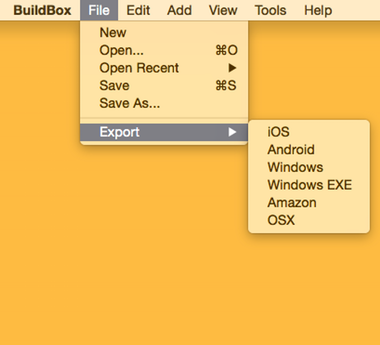 Just click on “File” from the main Buildbox menu (like pictured above) and then choose “Export >”. You’ll then see a list of export options, we recommend exporting for all of them!