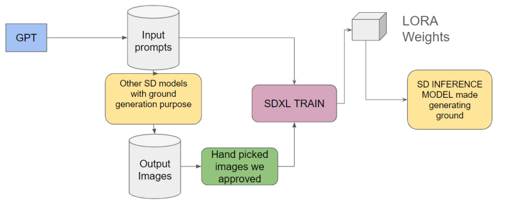 Our team trained the ground generation model using Stable Diffusion (SD) and examples from the current Replicate model using a “Teacher-Student” approach.