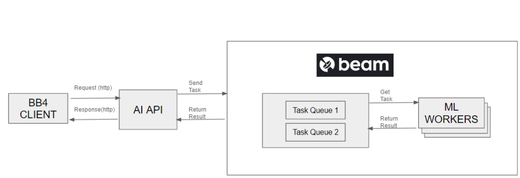 BEAM provides task queues to retrieve model inference results that are not instantaneous. This allows us to coordinate multiple users making heavy backend requests and generating multiple responses concurrently.