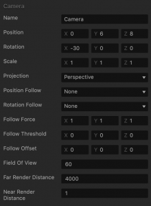| Follow Offset | Enter a numeric value for each axis to specify the distance between the camera and its target object, which should be kept during the game. |