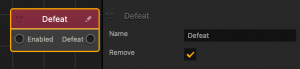 This action node disables all nodes in the node map, then activates any nodes connected to the Defeat output. For a use case example, see Health, Damage, and Defeat.
