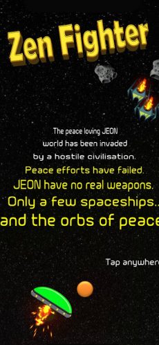 Zen fighter is an action game with a new twist in fighting off hordes of enemy spaceships. Having banned war weapons years ago, your world has almost nothing to defend themselves. Except for the ORBS of power. Deflect the ORBS using your spaceship and shields and use them as projectiles to destroy the enemy ships. Along the way, special power ups will help you in your journey to save your home world from certain devastation.